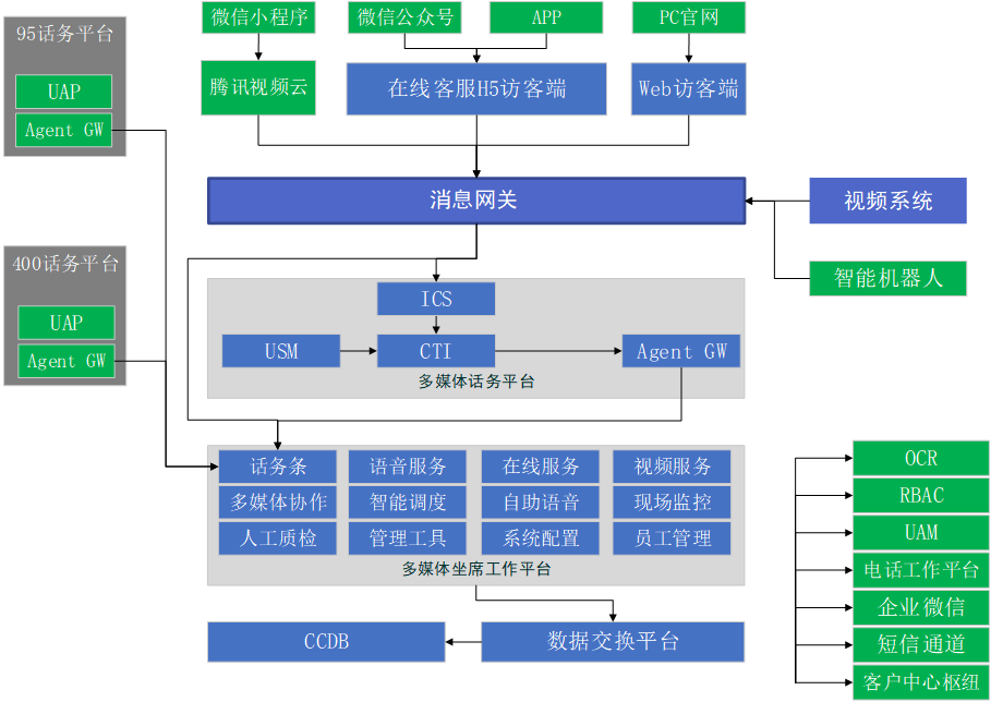 1.APP、官網、微信小(xiǎo)程序渠道統一接入到(dào)多媒體話(huà)務平台進行(xíng)路(lù)由服務